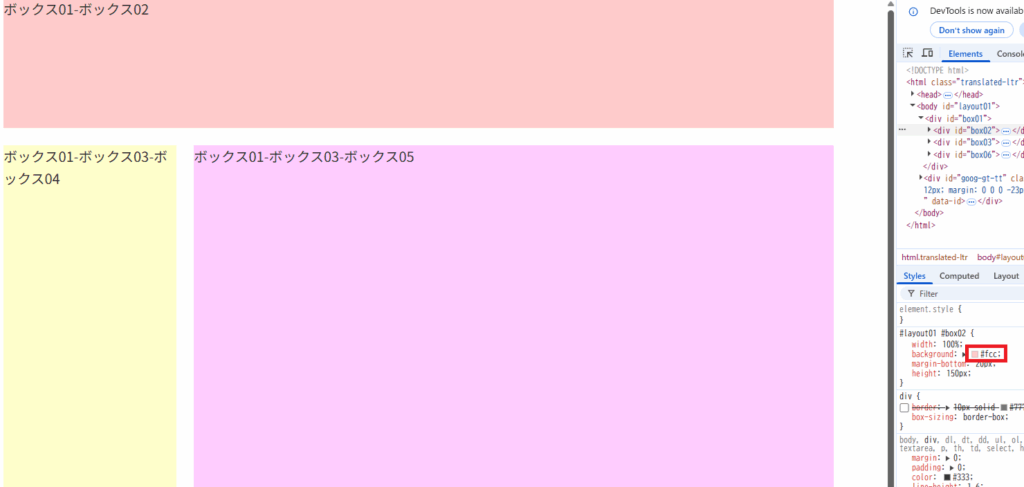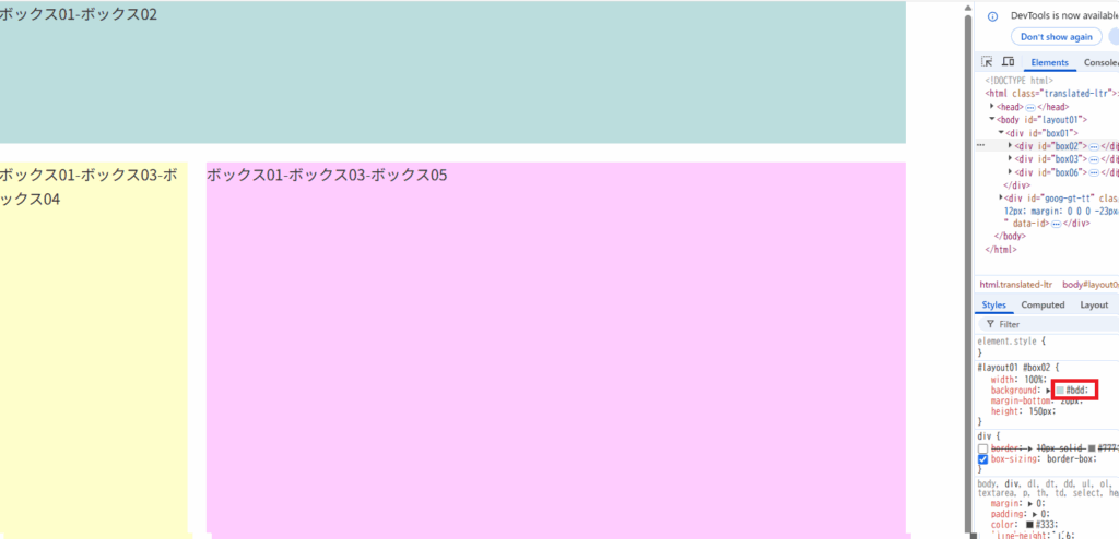 【#bdd】に変更すると…〈ボックス01-ボックス02〉の色が変わりました!