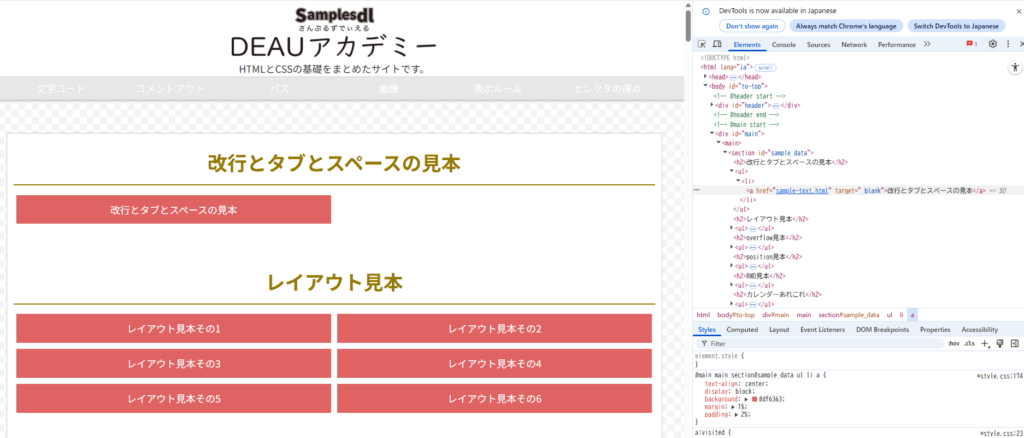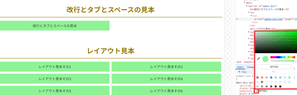 また、アクティブにして選択(クリック)するとアクティブは解除され、選択部分がElementsで背景色が付く。