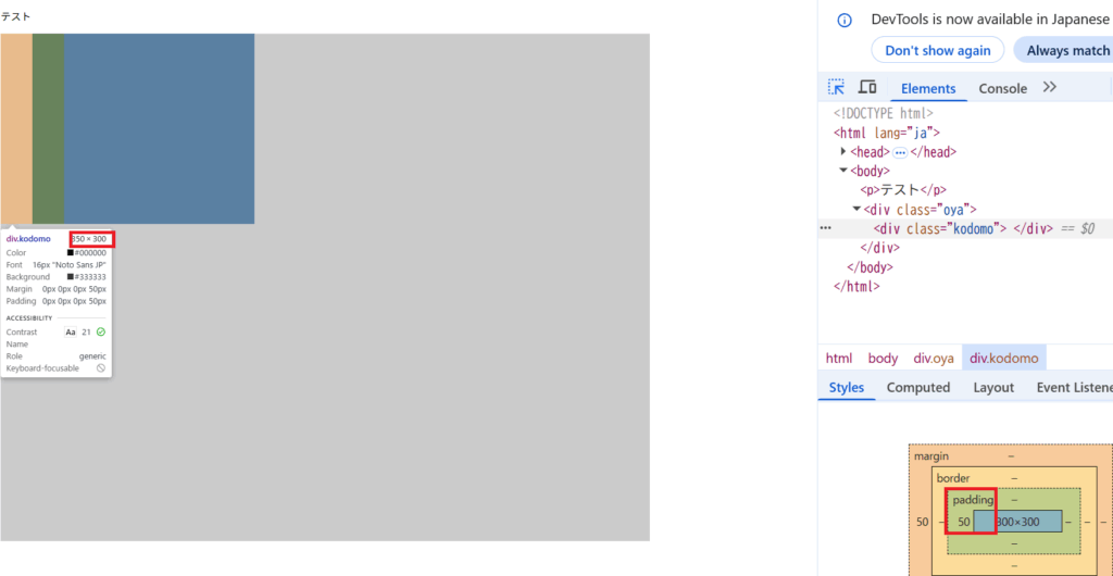 パディング50PXにすると、要素が広がってしまうのでbox-sizingを入力すると、